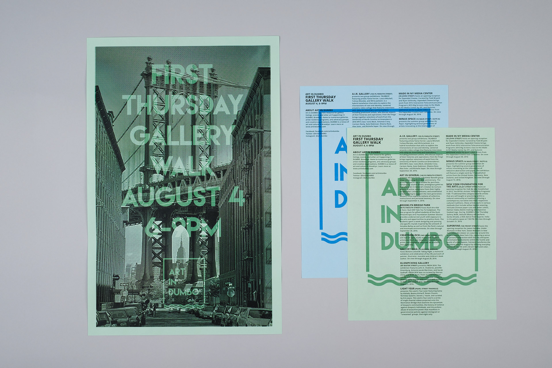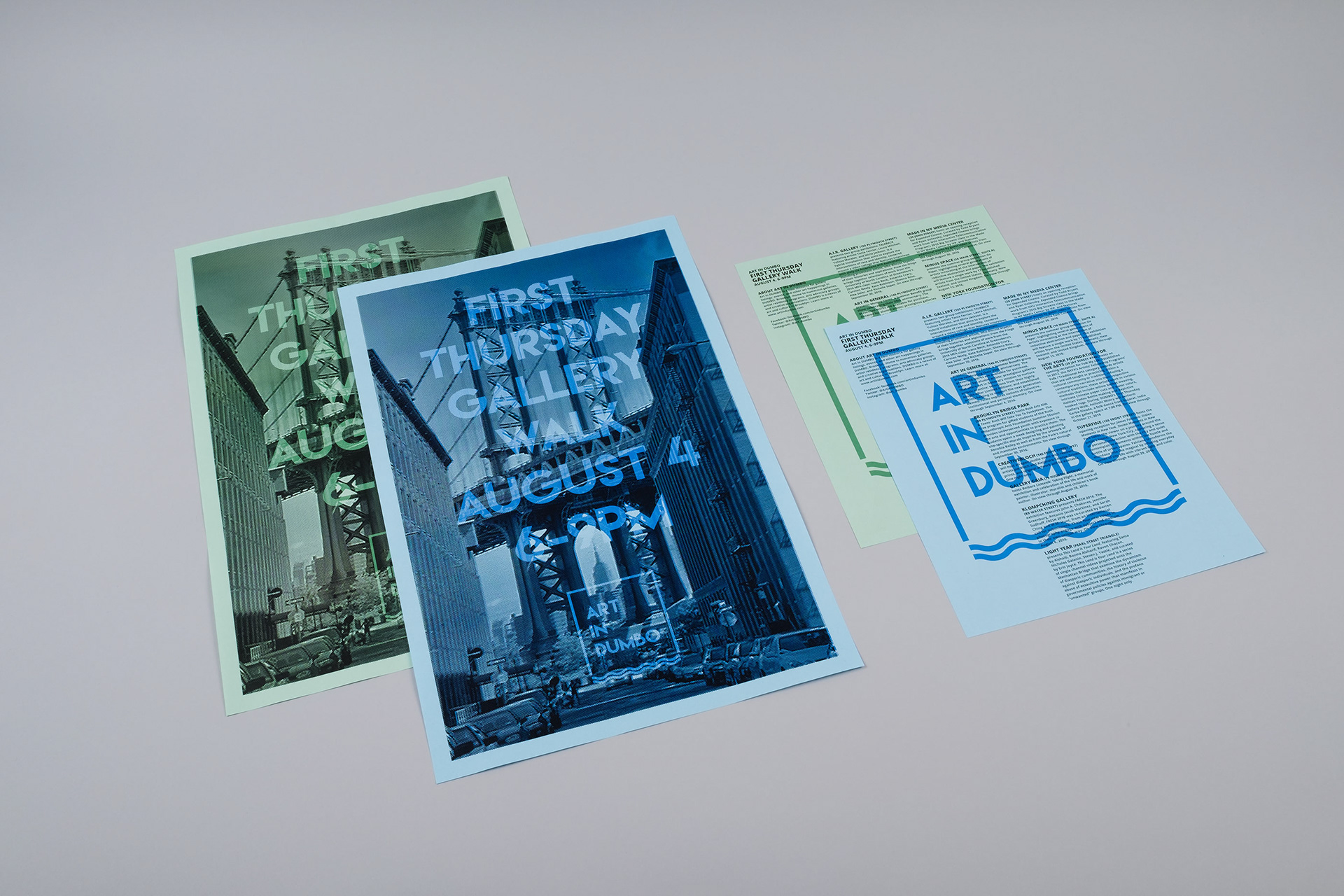 Art in DUMBO produces exhibitions, residencies, artworks and events in the formerly industrial Brooklyn neighborhood of DUMBO. These posters, maps, and gallery guides, produced for the monthly first Thursday gallery walk, provide a high-impact visual marker for participating businesses and institutions.